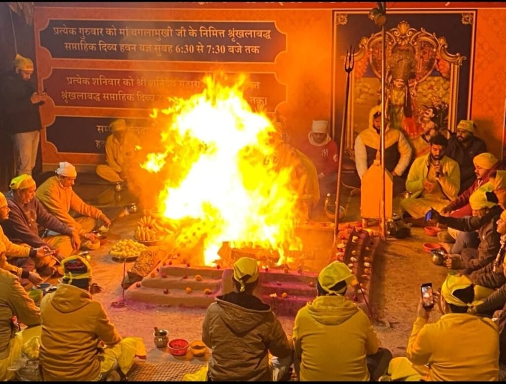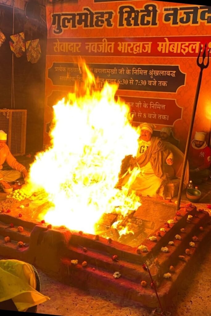 से वैदिक रीति अनुसार गौरी गणेश, नवग्रह, पंचोपचार, षोडशोपचार, कलश, पूजन उपरांत ब्राह्मणों ने आए हुए सभी भक्तों से हवन-यज्ञ में आहुतियां डलवाई। मां बगलामुखी जी के निमित्त भी माला मंत्र जाप एवं हवन यज्ञ में विशेष रूप आहुतियां डाली गई। हवन-यज्ञ की पूर्णाहुति के उपरांत नवजीत भारद्वाज ने आए हुए मां भक्तों हुए मां भक्तों को सुमधुर स्वर में भजन का गायन करके निहाल किया।